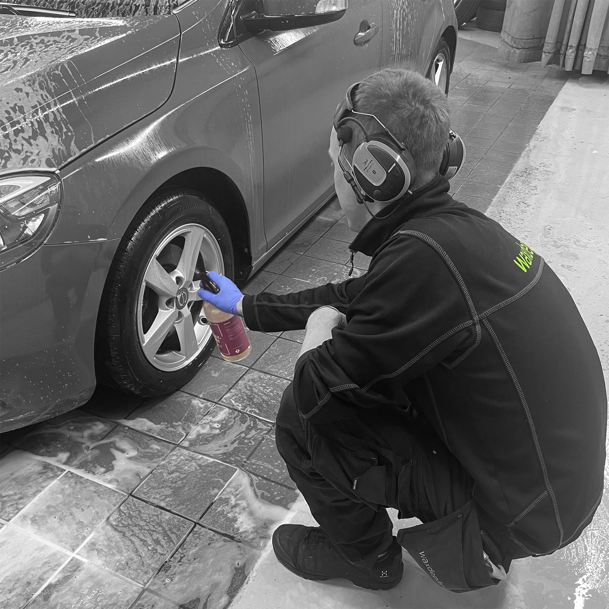 ”Flygrostlösaren kör vi efter förtvätten, särskilt på bakpartiet och nedre panelerna. När den börjar slå om till lila vet man att den jobbar som den ska.”